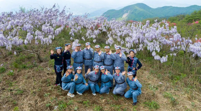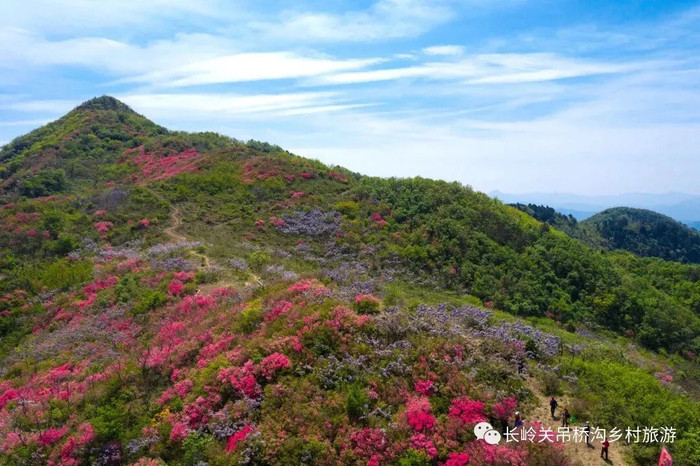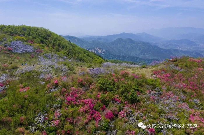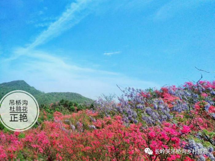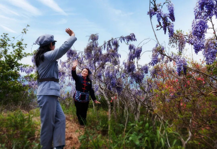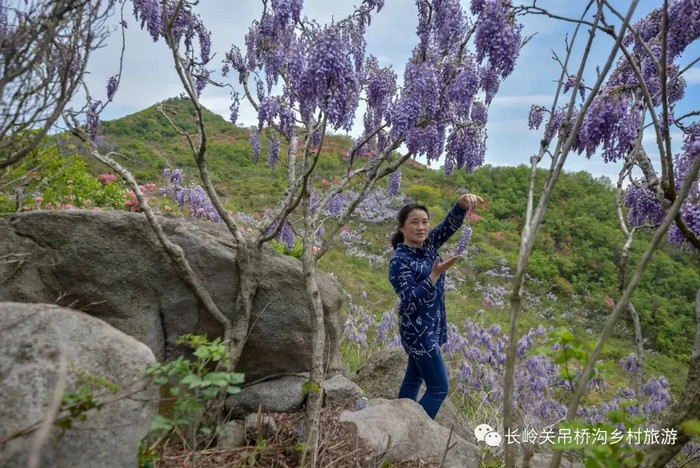 导游介绍说:吊桥沟紫藤花海有原生态杜鹃花1万余亩,其中紫藤花1千余亩,2017年4月被武汉户外团队首次发现。2018年开始对外宣传推介,逐渐被人们知晓;2019年4月举办第二届长岭关生态文化旅游节暨首届紫藤花节,万紫千红的奇妙画卷渐入人心,但山高路远美景难接近;2020年春,疫情突发,村委会引导滞留在家村民义务修通10公里环花海游步道和万步登山台阶,紫藤花海慢慢走红;然而徒步10公里赏花还是不被大众接受,6月,村委会依托防火隔离带建设决心修通花海4.4公里赏花公路。