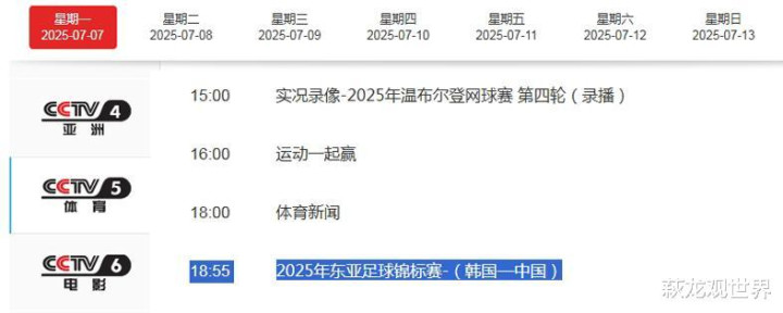 北京时间7月7日晚19:00,东亚杯小组赛首轮,韩国队VS中国队,央视体育频道没直播世预赛,主要是因为没拿到版权,此番CCTV5进行现场直播!如果是双方尽遣主力出场,国足八成不是韩国队的对手,但东亚杯对于各队来说,最重要的是锻炼新人,日韩海外实力派球员没必要参赛。