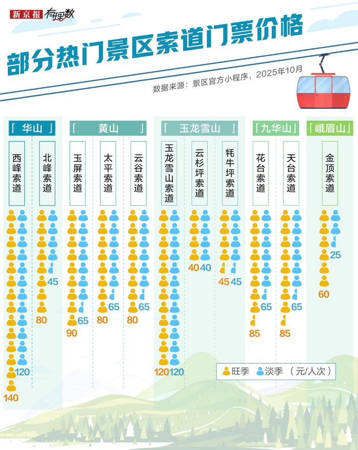 我们观察了国内比较有名的景区索道单趟价格,发现华山西峰索道旺季要140元一人次,是几个名山中最贵的;峨眉山金顶索道淡季25元一人次,相对亲民便宜些。