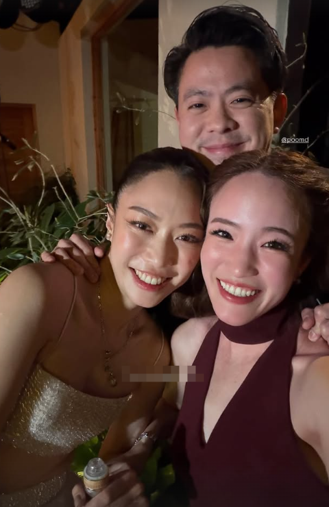Namfon穿白色礼服亮相,笑容灿烂与来宾合照,小腹隆起疑似怀孕,还有一张是Namfon和闺蜜的合照,上方是霍启仁与妻子手牵手的爱心图,两位新人当天应该玩得很开心。