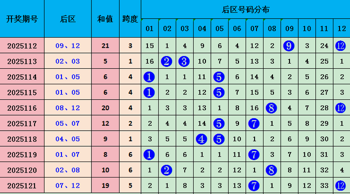 后区分析:上期后区开出07 12,和值19,较上期和值上升,本期预计和值会下降,看好号码05 10,和值15。
