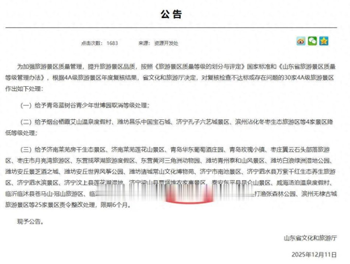 12月11日,山东省文化和旅游厅发布一则公告,根据4A级旅游景区年度符合结果,对30家旅游景区作出处理,其中德州庆云县海岛金山寺被责令整改处理,限期6个月。