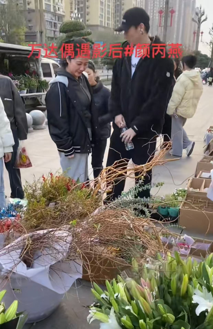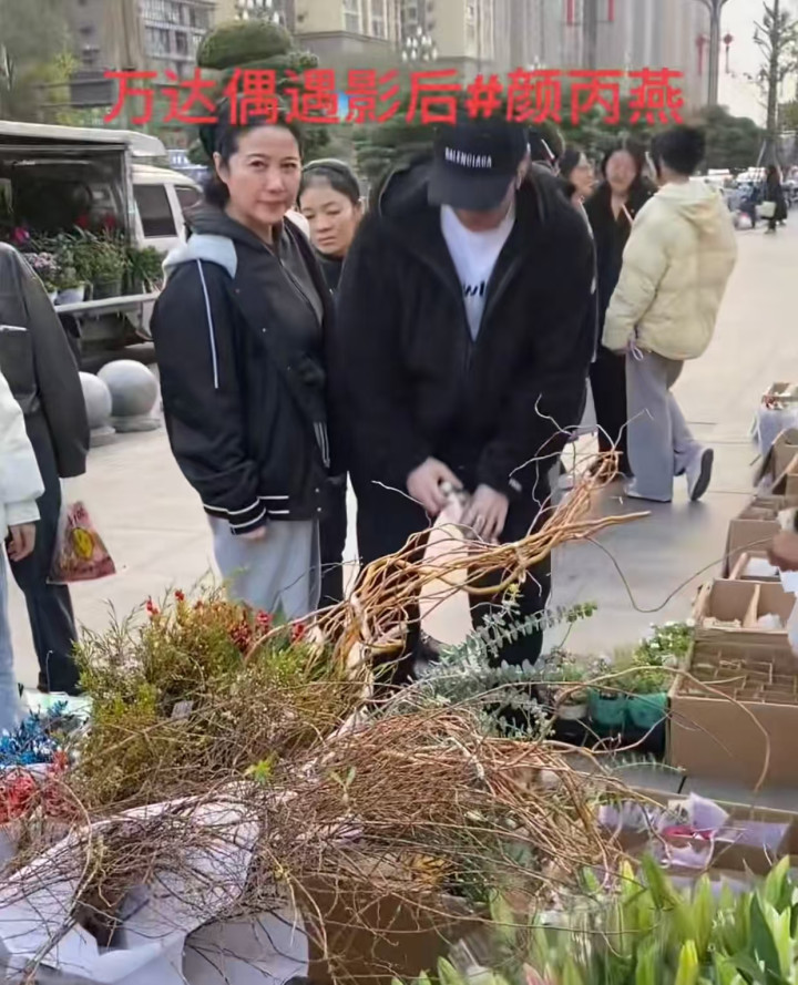 颜丙燕身穿灰色休闲裤、黑色夹克,头发自然地扎着,男友蹲在旁边看花卉,男友起身时,颜丙燕也抬头,发现有人正在对着她拍摄,但并未说什么。