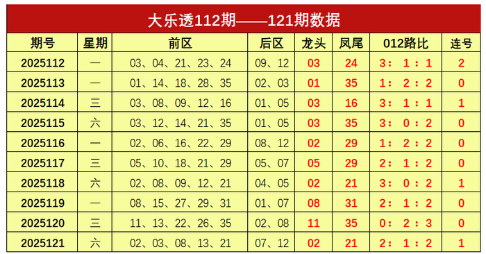 大乐透第2025121期出奖号统计:前区02、03、08、13、21,后区07、12。龙头02,凤尾21,012路比为2:1:2,开出1组连号。