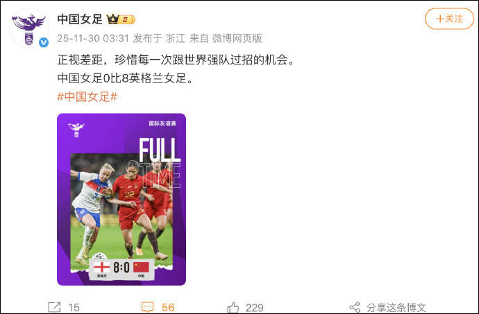 输一场球不可怕,可怕的是看不清为什么输。认清差距,脚踏实地,未来的路才能走得更稳,才能让“铿锵玫瑰”在世界舞台上再一次绽放。